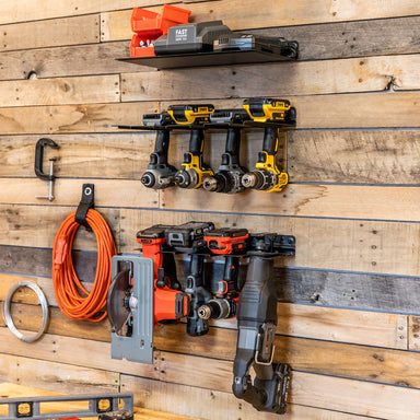 All-in-one storage for power tools and accessories Includes (1) Power Tool Rack and (2) Shelves Rack holds drills, drivers, saws, multi tools, gri...