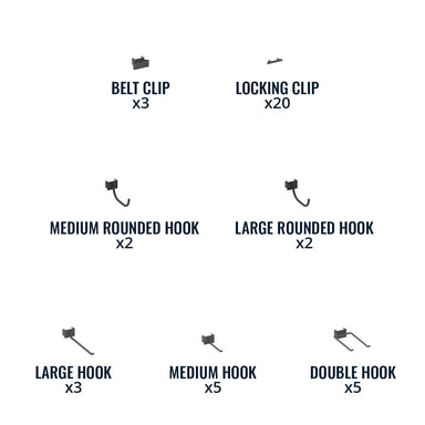 Add extra storage to your metal pegboard system (20) Storage attachments hold a variety of tools Includes a variety of hooks and belt clip holders...