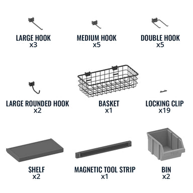 Add extra storage to your metal pegboard system (21) Storage attachments hold a variety of tools Includes hooks, shelves, baskets, bins, and more ...